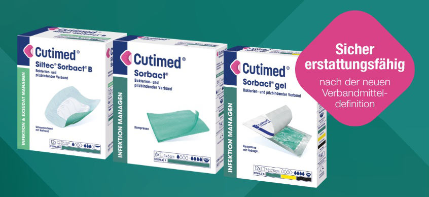 Cutimed Sorbact – unsere Wundverbände für die infizierte Wunde – sind und bleiben aufgrund ihrer rein physikalischen Wirkweise als DACC beschichtete Wundauflagen weiterhin erstattungsfähig. Dies gilt auch für Cutimed Sorbact Gel Kompresse. Versorge infizierte Wunden ohne bekannte Risiken**, Kontraindikationen** und Mechanismen zur Resistenzbildung. Cutimed Sorbact setzt keine aktiven Wirkstoffe in die Wunde frei.
