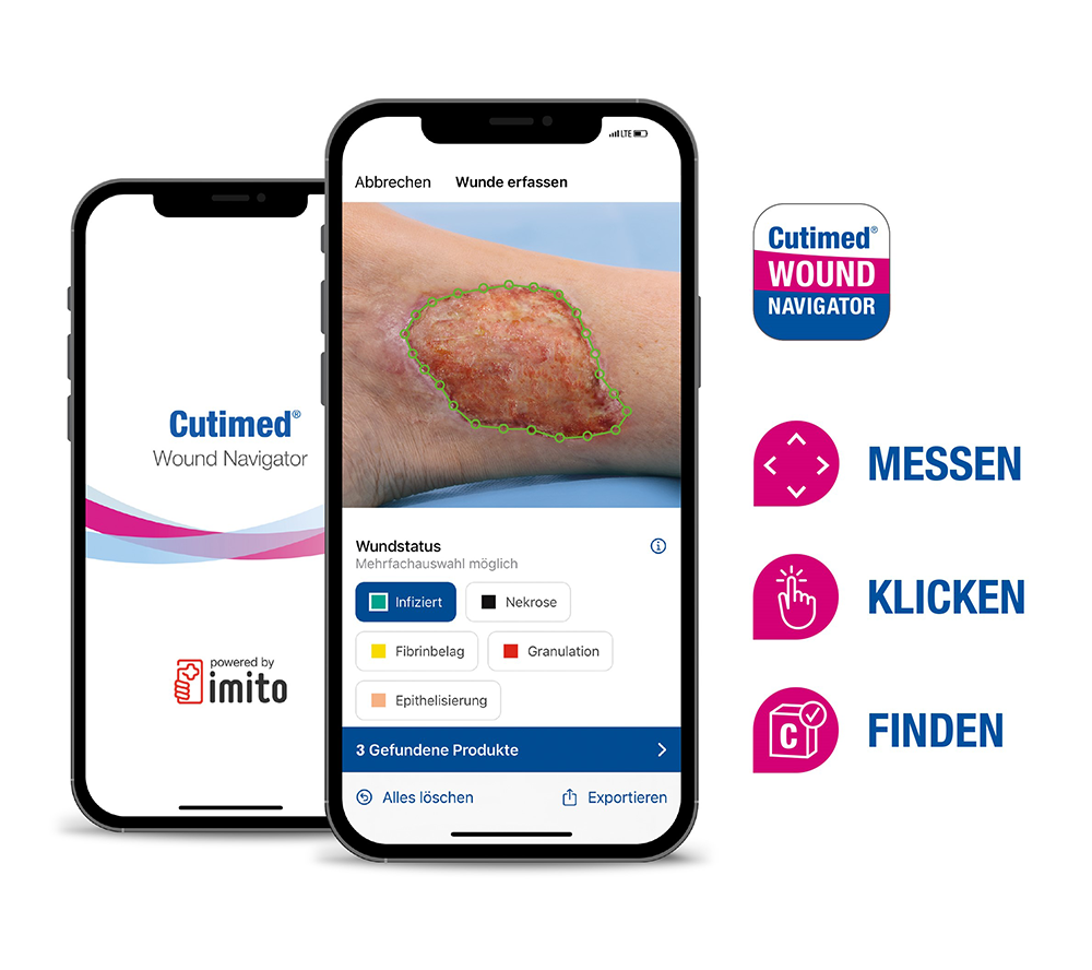 Nun bietet der Cutimed Wound Navigator die Unterstützung, die Ihnen in wenigen Schritten sofort und überall die passende Produktauswahl inklusive PZN-Bestellinformationen für chronische Wunden an die Hand gibt – schnell und intuitiv. Laden Sie sich jetzt kostenlos die App für Ihr Smartphone und Tablet herunter. Bestellen Sie sich ebenfalls die Cutimed Kalibrierungsmarker, die Sie für das interaktive Messen der Wundgröße benötigen.