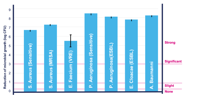 In einer aktuellen In-vitro-Studie, bei der eine Standardtestmethode (JIS L 1902)12 angewandt wurde, konnte gezeigt werden, dass Sorbact Wundverbände effektiv Bakterien bindet, die von der WHO aufgrund ihrer krankheitsverursachenden Eigenschaften als bedrohlich eingestuft wurden. Zu den getesteten Bakterien gehören antibiotikaresistente Stämme wie MRSA und VRE sowie andere häufige und problematische Wundpathogene. Die Ergebnisse zeigten eine deutliche Verringerung des mikrobiellen Wachstums.