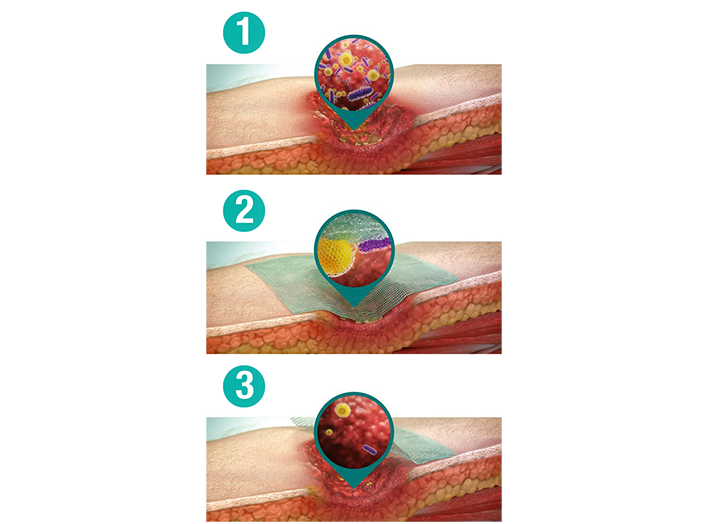 - Entfernen: Beim Verbandwechsel werden gebundene Bakterien, Pilze und Endotoxine sicher entfernt.